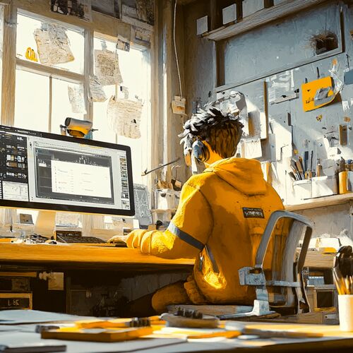 - Bildgenerierung: Basierend auf unserem gewählten Thema nutzen wir ein KI-Bildgenerierungstool wie DALL-E oder Midjourney. Prompt-Beispiel: "Erstelle ein Bild, das einen Tischler zeigt, der an einem Laptop arbeitet, umgeben von traditionellen Werkzeugen und digitalen Icons."